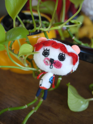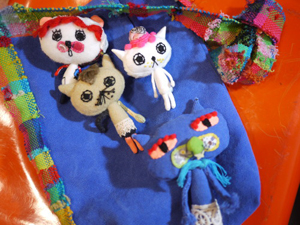 アンポンターンズはご覧いただいております通りの和み系キャラクター、世間様でいうところのユルキャラです。古着をリメイクしたり、アメリカのフィードサック、アンティークレースを散りばめながら、作家中田えみ自身が一体一体手作りしております。