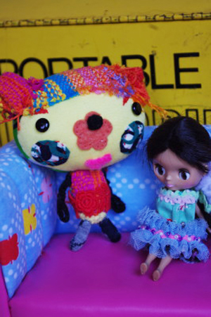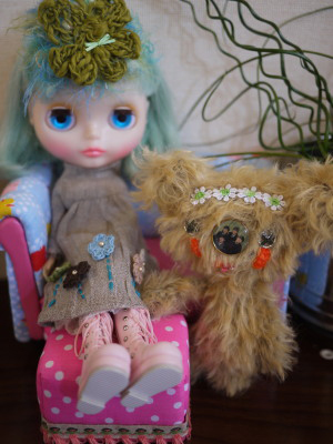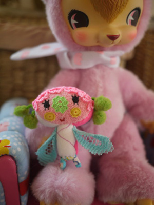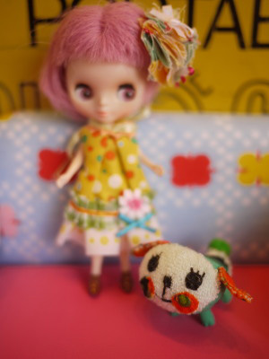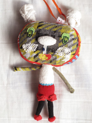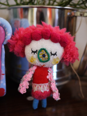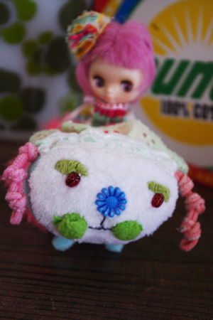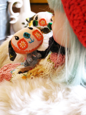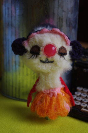 詳細:ピンク毛糸のドレッドヘアにレトロボタンのカクテルハットと、出で立ちは派手ですが、心根はシャイ&ピュアな女の子。その証拠に、青ざめた顔をしながらも、頬は照れくささで上気しています。後頭部と胴体はヴィン生地で、スカートはアンティークレース。チンとかシーズーとかの鼻ぺちゃ犬に親近感を覚える顔立ちです。