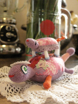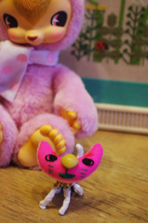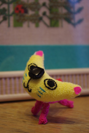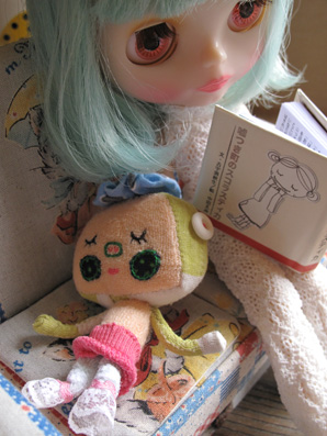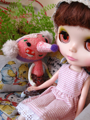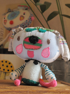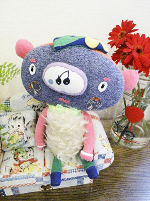 詳細:ピンクの髪を三つ編みおさげにした文学少女。体と鼻の土台がレトロ生地で、ヴィン生地の高級おパンツが丸見えです。腕は外側と内側で色の違うツートン。体型は巾着、もしくはちまき型です。開いた本の上にうつ伏せになって、突き出た鼻でページを押さえつけながら読書します。