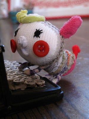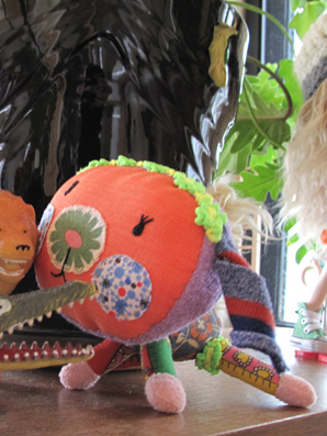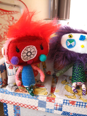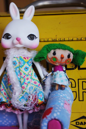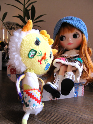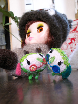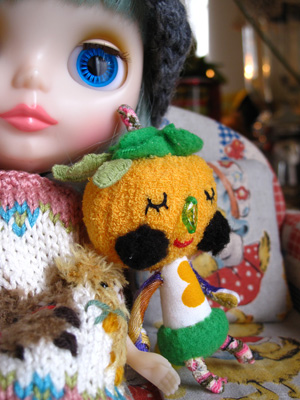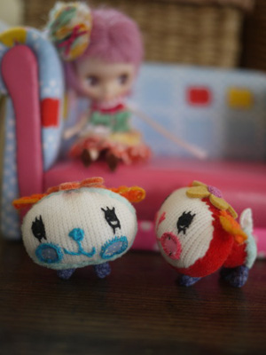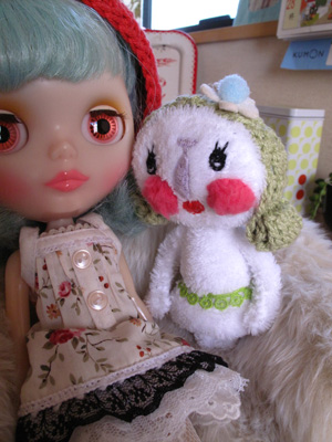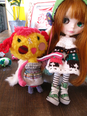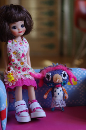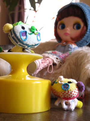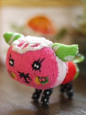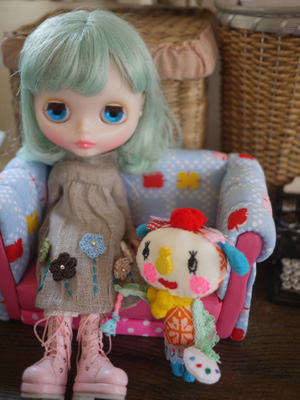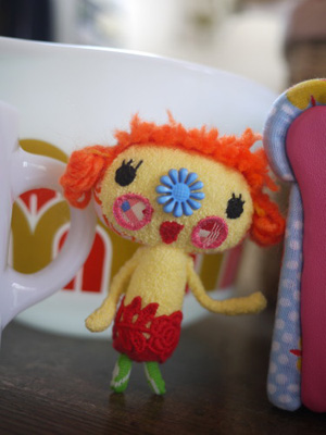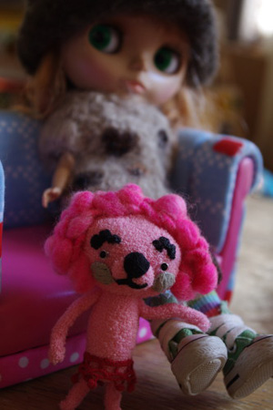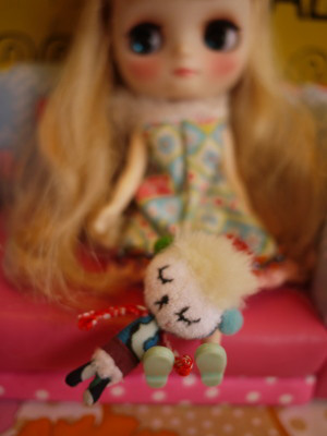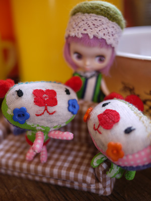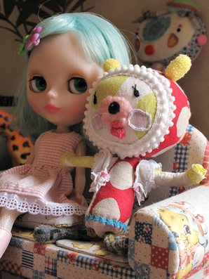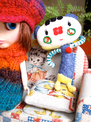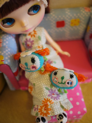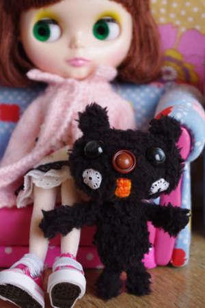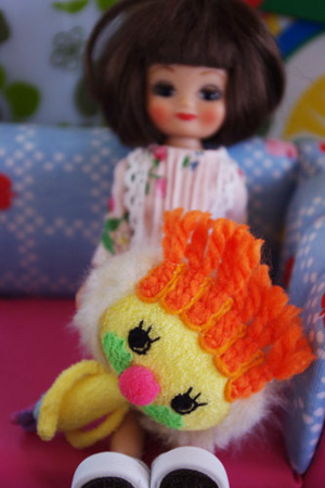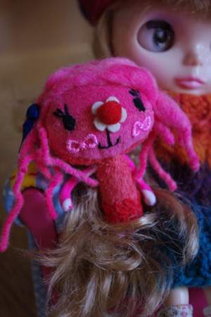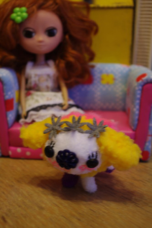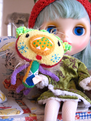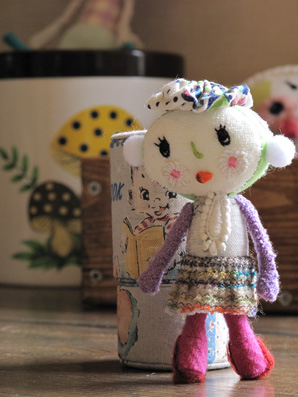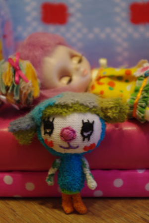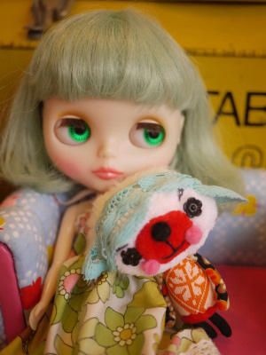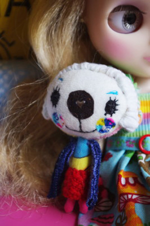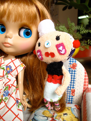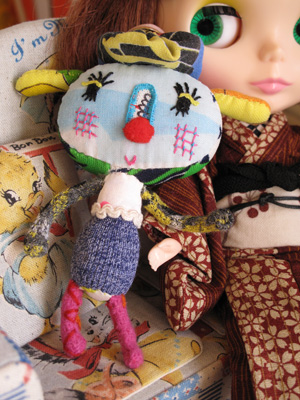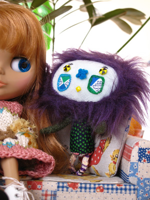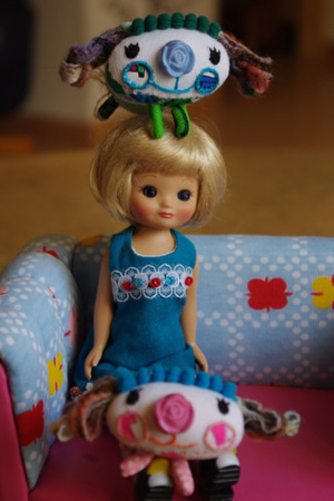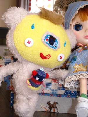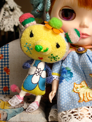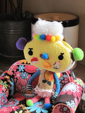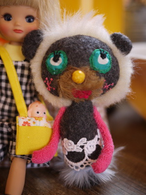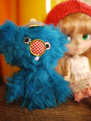 詳細:今のところアンポンの中で唯一、頭全体を覆う進化型の髪を持っています。前髪と脚はヴィン生地で、中心が輝く鼻はレトロボタン。目はハート形のヴィンテージボタンです。飛び跳ねて、ショートボブの髪をワサッと羽ばたかせたいのですが、髪質硬めであまり揺れません。アク○ンをリンス代わりに使いたがっています。