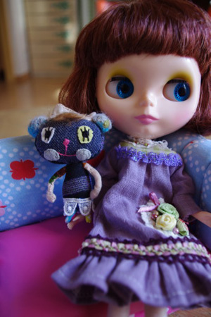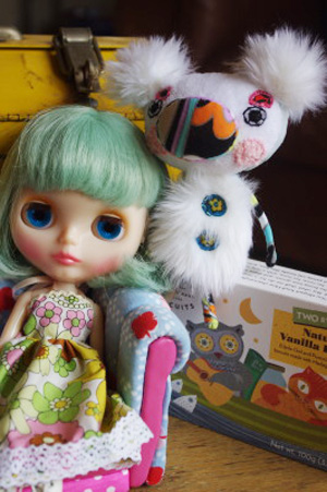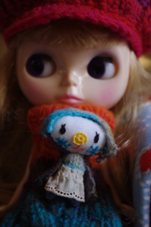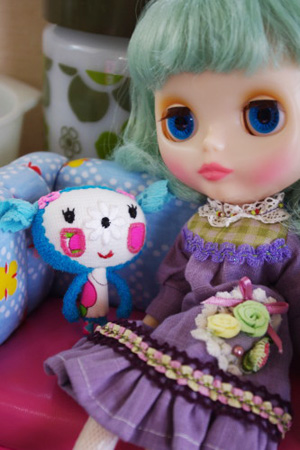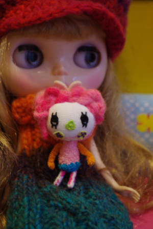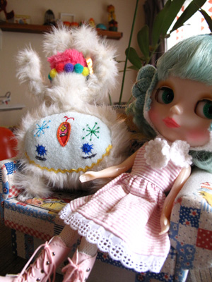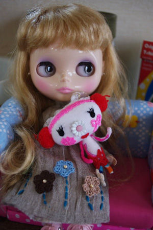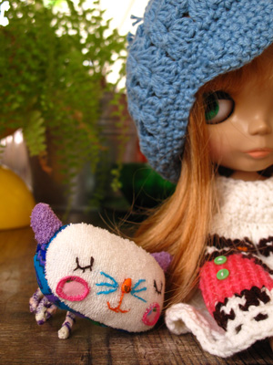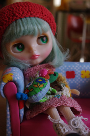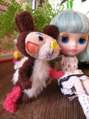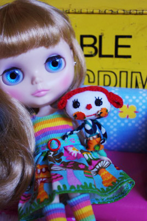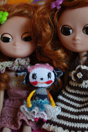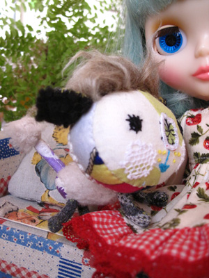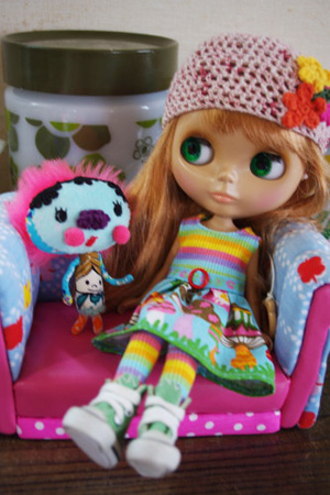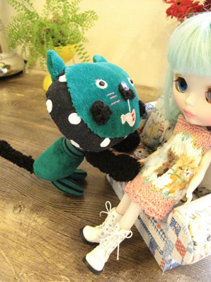 詳細:後頭部は服とお揃いのアンティークな水玉。側頭部はふんわりニットです。おつまみの「貝ひも」みたいな腕をしていて、しゃぶり付きたくなります。