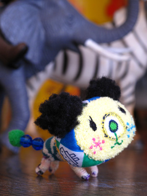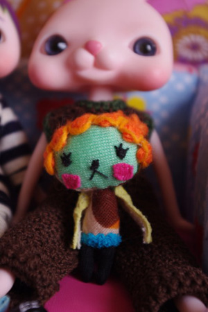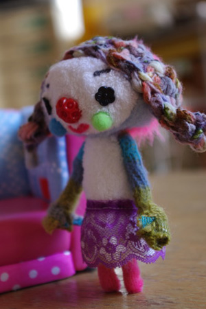 詳細:手のりサイズのちびちび女の子。腕、脚、体とドレッド風の髪はヴィン生地で、後頭部と白パンツはフワフワ起毛。うっかりスカートをはき忘れたのではなく、ショートパンツです。チビッコなので、見上げる目線が身に染み付いています。膝を折って目線を合わせると、照れくさそうにやっぱり上目遣いです。