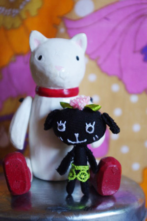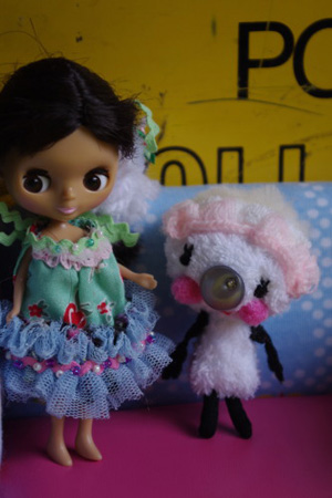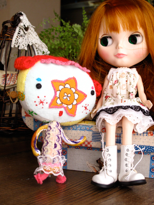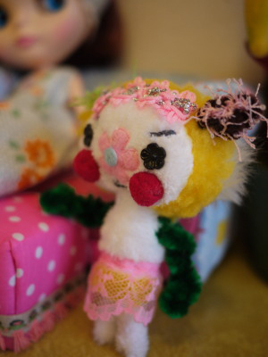 詳細:くるりと外はねした手編みニットの髪にピンクのベレー帽を被り、レトロボタンでとめています。お鼻はヴィンテージビーズ。レースリボンの涼しげなスカートが、精一杯のセクシーアピールです。
