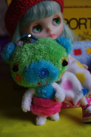 詳細:春の香がして冬眠から目覚めたものの、「まだ寒いじゃん」と二度寝しようとしているねぼすけクマポン。顔と背中は緑、お腹は青の寒色系。カビてるとか失礼なこといわないで。見た目寒々しかったのですが、ピンクの腰巻きスカートで、身も心も暖かになりました。お鼻は花ボタン。頭にレトロボタンの帽子を乗っけています。