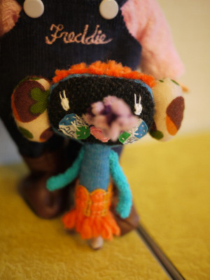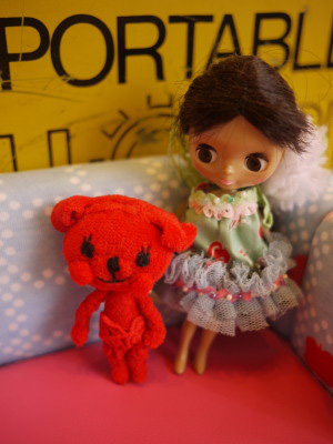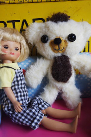 詳細:こちらはまだ冬眠中のクマポンタン。寝ている間に付けまつ毛とアイシャドーでイタズラメイクされちゃいました。目覚めたとき、「寝てる間にまつ毛伸びたね」といってやったら信じそうです。鼻はレトロボタン、腕はリボンテープ、脚はヴィン生地。「女の子だから、お腹を冷やしちゃいけないの」とのことで、スカートの素材は毛糸です。