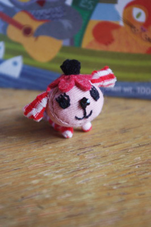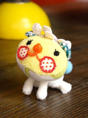 詳細:ゴマフアザラシの赤ちゃんのような、タンポポのような、綿毛のアンポン。鼻はレトロボタン、腕はリボンテープ、毛糸のカチューシャをしています。ホッペはピンクでたこ焼き状。いつでも首を傾げて、色んな疑問を投げかけます。「私は体が白くて手足が黒いのに、何でパンダじゃないんだろう?」。答えて上げてください。