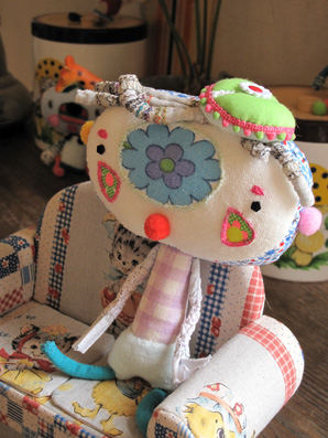 詳細:ヨーヨーキルトの帽子をレトロなボタンで止めています。ニットスカート&レースのソックスを履いていますが、基本、裸族です。ほっぺはヴィンテージ生地、お耳はレトロボタン。
