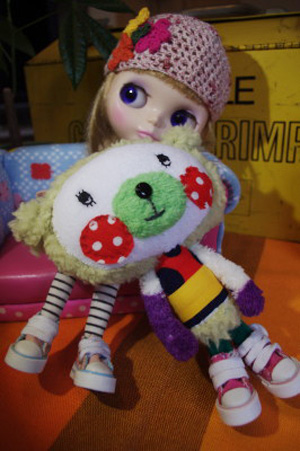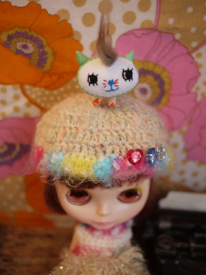 詳細:色白の犬っ娘。二重になっている耳の片側はヴィン生地です。後頭部はモコモコ水玉、前髪は毛糸のリボンテープ。前身ごろに子どものシロクマを住わせています。目の上はピンクのアイシャドウのバッチリメイク。誰かとハイタッチがしたくてうずうずしていて、左手がクリンと巻き上がっています、