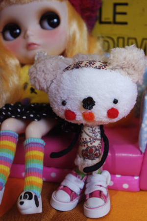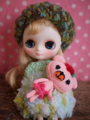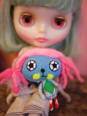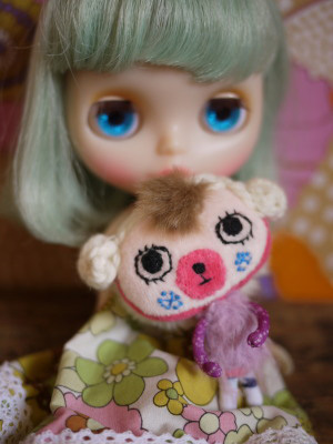 詳細:水色の顔に三白眼、クマっぽい口の女の子。ビビットなピンクの髪はドレッド風で、カリブとかジャマイカとかに馴染みそうな風貌です。ボディと脚はヴィン生地。後頭部にシロクマが住んでいます。顔の水平を保とうとすると、身体が斜めるので、寄りかからせて上げてください。