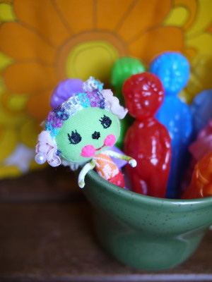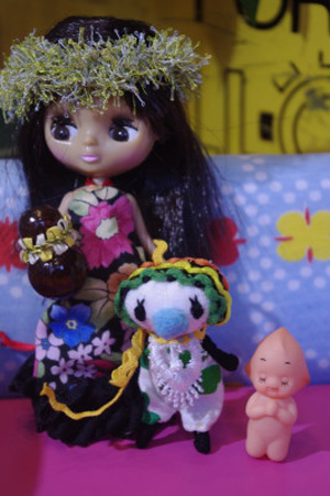 詳細:南国な雰囲気の女の子。胴体がヴィン、側頭部がレトロ生地、髪の毛と後頭部がモフ生地です。後頭部は赤と黒のホタル柄。ほっぺは赤のモフ生地、髪の毛に沿わせてリボンテープをあしらっています。ばかっぽい白いレースのチュールをつけていますが、「外見ほどばかじゃないのよ~」だそうです。スカートは黄色のリボンテープです。