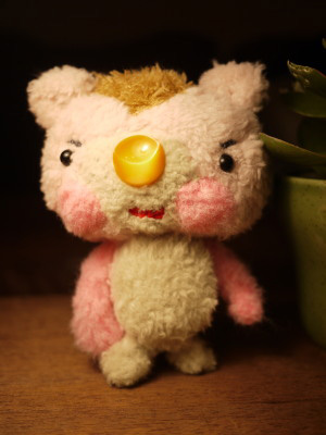詳細:赤い大ボンボンのボディに、ボンボン小を三段重ねにしたジャバラっぽい脚の根性ロボットです。傾けると目がぐりんぐりん動きます。頭の上に乗っているのはプロペラではなく、お花の帽子です。「ロボットの私にポンコと名付けるとは、悪意を感じるのです!名付け直しを要求するです!」と憤っています。良くできる子っぽい名前を授けてやってください。