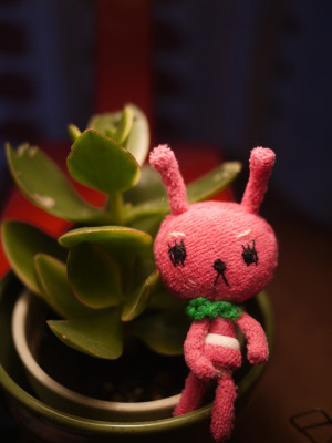 詳細:への字口のムスッとウサポン。ヴィンテージトレーナーをリユースしたピンクの体に、緑のマフラーを巻いています。ムスッとしている理由は、「後ろ姿がニコちゃん大王に似てるね」といわれたからかも。実は、機嫌を直すきっかけを欲しがっているので、大人な態度で慰めてやってください。