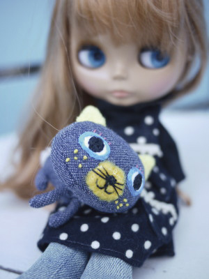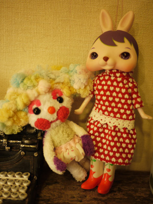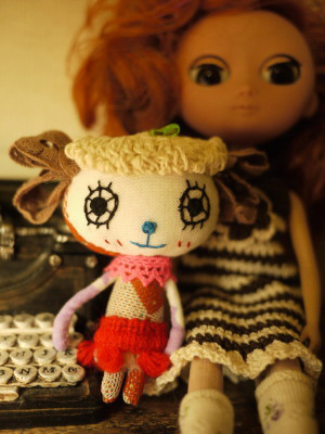 詳細:ちょこんと控えめな大人しい女の子。腕と脚はヴィン生地で、胴と頬はヴィンテージの別珍。髪は毛糸のリボンテープ。レースリボンのスカートをはいています。好みのタイプは「笑いのツボが同じ人」とのこと。それがどこにあるかは探してみてください。良く見るとすでに笑いを堪えている顔をしています。