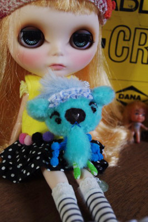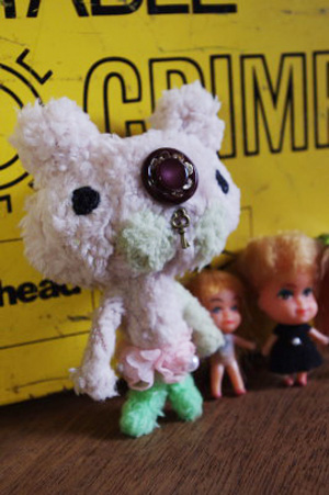 詳細:スキー焼けのゴーグル跡なのか、懐かしのヤマンバメイクなのかは不明ですが、とにかくインパクト大な子です。実はタヌキなのかもしれません。ベースはデニム風ニット生地で腕と脚はヴィン生地、ド派手な髪の毛はフェルト原毛で、良く見るとフランクフルトになっています。マスタードもかかっています。