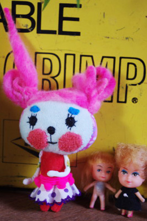 詳細:ピンク髪にドングリまなこのてへぺろっこ。細かいチェックの後頭部、側頭部、胴体はアメリカンヴィンテージ生地で、ツイストを踊りそうなフィフティーズテイストです。お鼻はフランス製のヴィンテージビーズ。長い髪を両サイドで無理矢理折り曲げて留めているので、日出る処の天子様のようになっています。