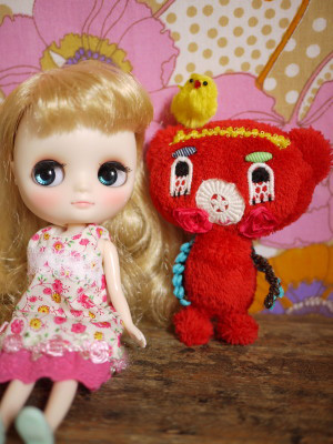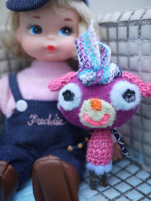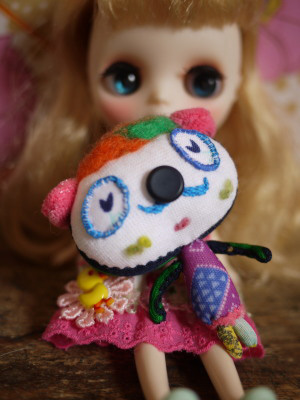 詳細:頭の上に何かのヒナを住わせている赤いクマポン。下まつ毛の長い目と鼻はレースのモチーフ、頬はピンクのバラ。眉毛はフランスのヴィンテージビーズで、頭には髪もないのにサッカー選手風の紐状ヘアバンドを巻いています。「お洒落に必要性を問うてはならぬ」だそうです。ヒナは巣立ちません。