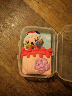 詳細:こちらもお布団持参のねんねちゃん。三角頭巾と手足はヴィン生地、ほっぺは黄色系フエルト、布団は寒色系と暖色系のリバーシブルです。いつか「世界一高い場所で寝たアンポン」とか「世界一賑やかな場所で寝たアンポン」とかでギネスに認定されるよう、頑張って寝ていきます。
