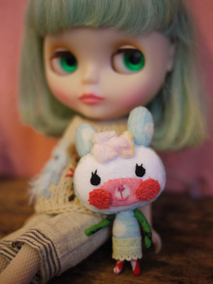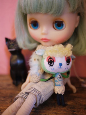 詳細:ストールを巻いたパリジェンヌ風の色白お洒落っこ。青髪はフェルト原毛でパンツはモフモフ、腕と脚はヴィン生地です。鼻はレースモチーフの花びらの一片。「スン」とした佇まいというものを目指していますが、いまいちよく分りません。あと微笑みをたたえる、とクスクス笑う、の違いも分っていません。